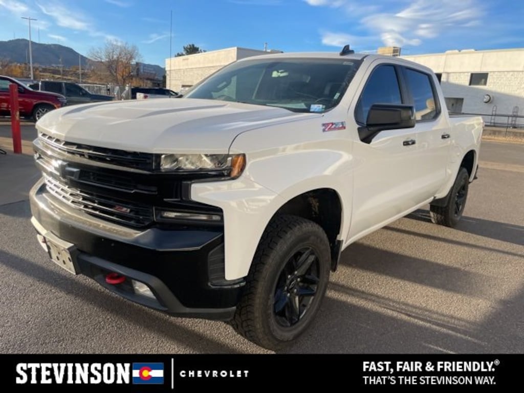 2019 Chevrolet Silverado 1500 LT Trail Boss All Season Tires, Back up Camera, Cruise Control, Keyless Entry, Remote Start, Trailer Hitch, USB / Aux Ports, Collision Alert, 8-Speed Automatic, 4WD, Black Leather, 10-Way Power Driver Seat w/Lumbar, 12-Volt Rear Auxiliary Power Outlet, 120-Volt Bed Mounted Power Outlet, 120-Volt Instrument Panel Power Outlet, 170 Amp Alternator, 2 USB Ports, 2 USB Ports (First Row), 4-Way Manual Driver Seat Adjuster, 4.2 Diagonal Color Display Driver Info Center, 6-Speaker Audio System, All-Weather Floor Liner (LPO) (AAK), Auxiliary External Transmission Oil Cooler, Bed Protection Package, Bluetooth® For Phone, Chevrolet Connected Access, Chevrolet w/4G LTE, Chevytec Spray-On Black Bedliner, Color-Keyed Carpeting Floor Covering, Compass, Convenience Package II, Convenience Package w/Buckets Seats, Deep-Tinted Glass, Dual Exhaust w/Polished Outlets, Dual-Zone Automatic Climate Control, Electric Rear-Window Defogger, Electrical Lock Control Steering Column, Electronic Cruise Control, Floor Mounted Console, Front Bucket Seats, Front LED Fog Lamps, HD Radio, HD Rear Vision Camera, Heated Driver & Front Passenger Seats, Heated Steering Wheel, Heavy-Duty Rear Locking Differential, High Capacity Air Filter, High Gloss Black Grille, High Gloss Black Mirror Caps, Hill Descent Control, Hitch Guidance, Keyless Open & Start, Leather Appointed Seat Trim, Leather Package, Leather Wrapped Steering Wheel, LED Cargo Area Lighting, Manual Tilt Wheel Steering Column, Manual Tilt/Telescoping Steering Column, OnStar & Chevrolet Connected Services Capable, Performance Red Recovery Hooks, Power Door Locks, Power Front Windows w/Driver Express Up/Down, Power Front Windows w/Passenger Express Down, Power Rear Windows w/Express Down, Power Sliding Rear Window w/Rear Defogger, Preferred Equipment Group 2LT, Premium Bose 7-Speaker Sound System, Radio: Chevrolet Infotainment 3 Plus System, Rear 60/40 Folding Bench Seat (Folds Up), Rear Dual USB Charging-Only Ports, Rear Vision Camera, Rear Wheelhouse Liners, Remote Vehicle Starter System, Single-Zone Manual/Semi-Automatic Air Conditioning, SiriusXM Radio, Steering Wheel Audio Controls, Suspension Package, Theft Deterrent System (Unauthorized Entry), Trailering Package, Universal Home Remote, Up-Level Rear Seat w/Storage Package.We're very proud of being in business for over a half-century selling and servicing cars to generations of satisfied Coloradans. Thank you, Colorado, for allowing us to serve your automotive needs for the last 60 years. We look forward too many more years of providing you with the best experience when buying or servicing your Chevrolet. Shop us 24/7 at www.stevinsonchevrolet.com Lakewood, Golden, Aurora, Arvada, Denver, Highlands Ranch, Lone Tree, Morrison, Pine, Windsor, Loveland, Brighton, Broomfield, Parker, Englewood, Littleton, Evergreen, Castle Rock, Westminster, Central City, Boulder, Thornton, Greenwood Village, and BENNETT!